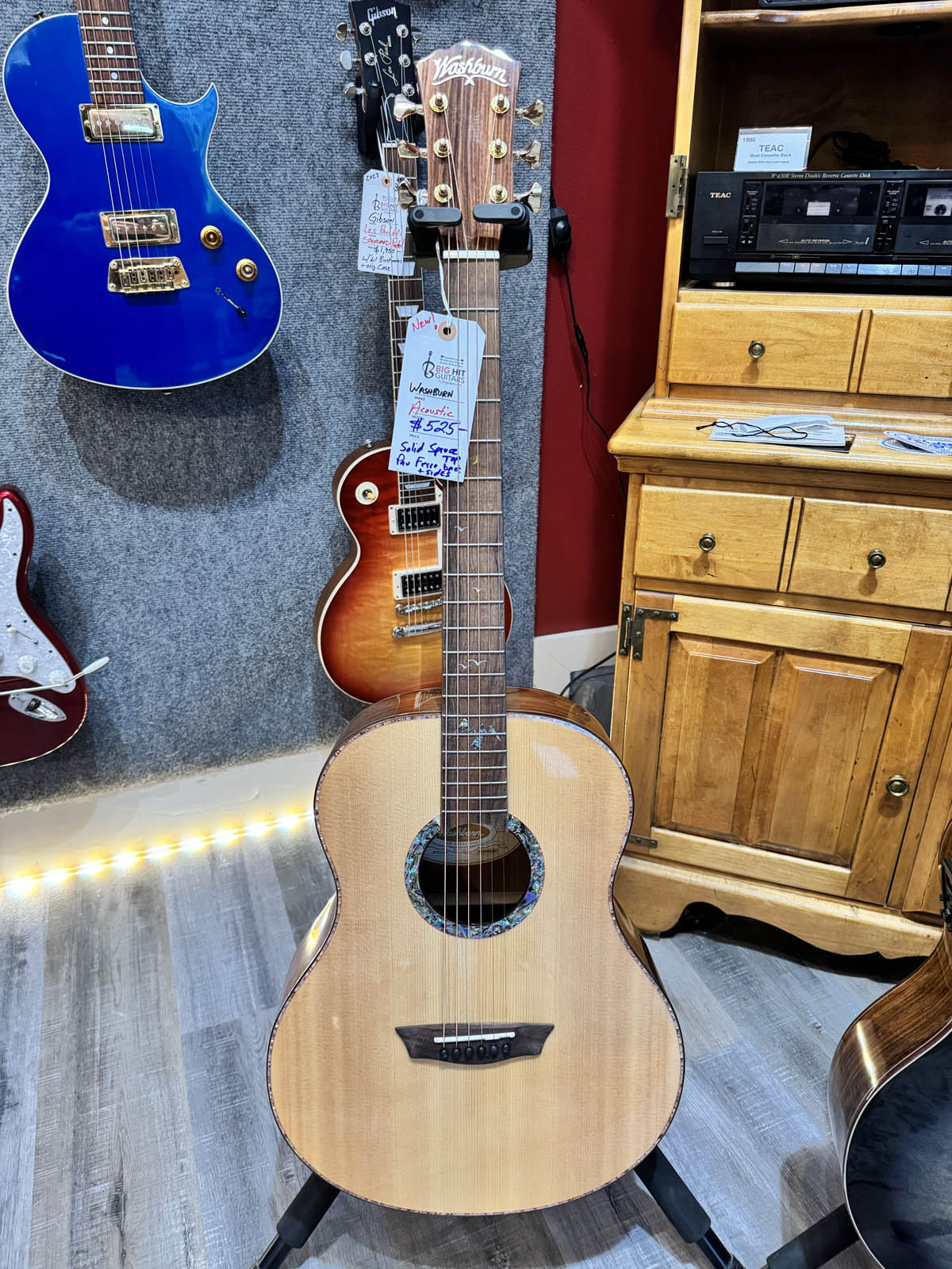 NEW! This Washburn is unbelievable when you consider the features: solid spruce top, Bolivian Rosewood back and sides, Fishman electronics, beautiful inlays and binding, with…