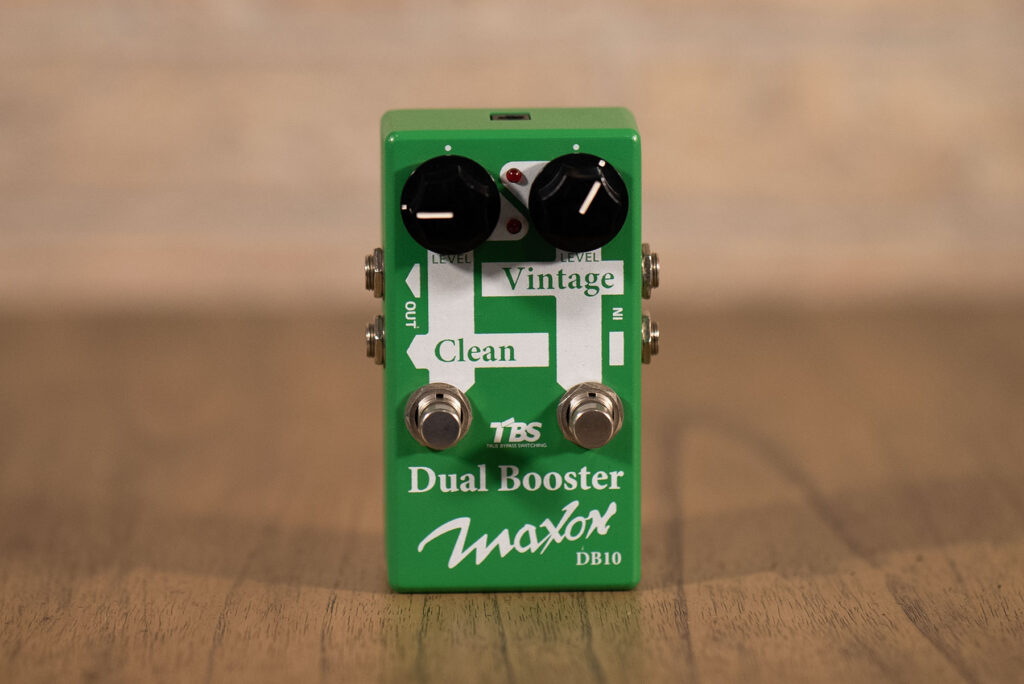 2 completely independent boost circuits in a single compact housing. The Clean (Left) channel offers up to +20 dB of clean boost with a completely flat frequency response. The Vintage (Right) channel is Maxon' take on the classic Treble Booster circuit. It offers up to +20 dB of boost, but with a subtle high-frequency roll-off that increases as the Level is turned towards maximum.